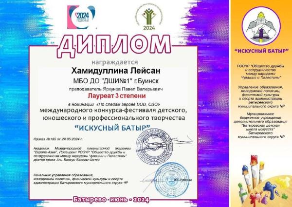 Подведены итоги международного конкурса-фестиваля детского и профессионального творчества "Искусный Батыр", по итогам которого, учащиеся художественного отделения: Тимофеев Артём, Шагаиева Нурия, Хамидуллина Лейсан стали лауреатами 2-3 степени.