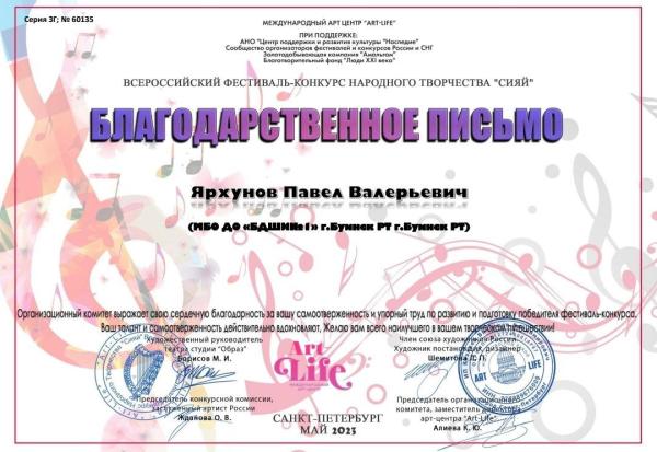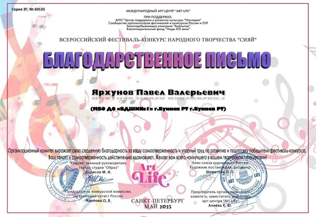 Преподавателю Павлу Ярхунову выдано благодарственное письмо.
