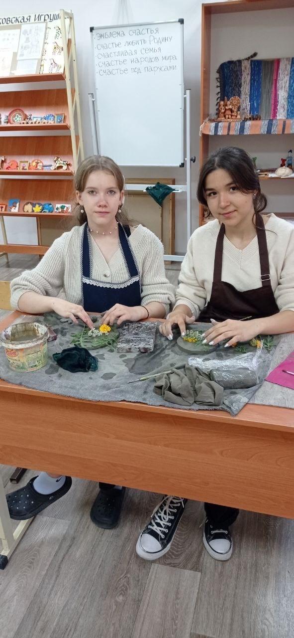 Учащиеся изготовили из глины контррельеф, используя природные материалы: цветы, листья, веточки.