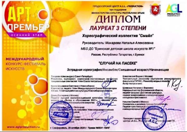 Хореографический коллектив "Смайл" (Руководитель Макарова Н.А.) с радостью принял участие в Международном конкурсе-фестивале искусств "АРТ Премьер", при поддержке Министерства культуры Республики Крым.
