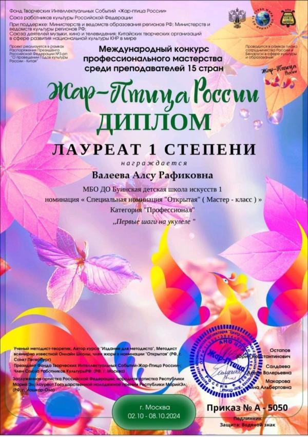 Преподаватель класса гитары Валеева Алсу Рафиковна приняла участие в Международном конкурсе профессионального мастерства среди преподавателей 15 стран «Жар - Птица России».