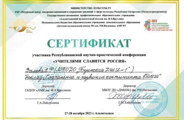 В конференции приняла участие преподаватель класса гитары Валеева А.Р. Она выступила с докладом и была удостоена сертификата участника.