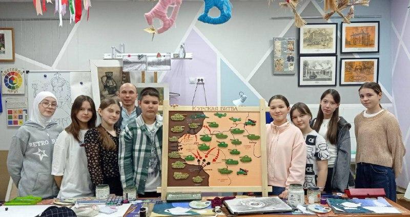 В рельефной форме, из глины выполнены силуэты танков и военной техники. На композиции изображена основная схема истВ рамках мероприятий посвящённых году защитника Отечества учащиеся 4(5) класса выполнили коллективную работу посвящённую Курской битве 1943 года.