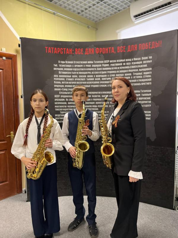 В торжественном мероприятии, посвященном Дню победы в Буинском краеведческом музее города выступили учащиеся класса духовых инструментов Камулутдиновы Аяз и Амина ( преподаватель Танкова О.К.) и Мусина К.С.