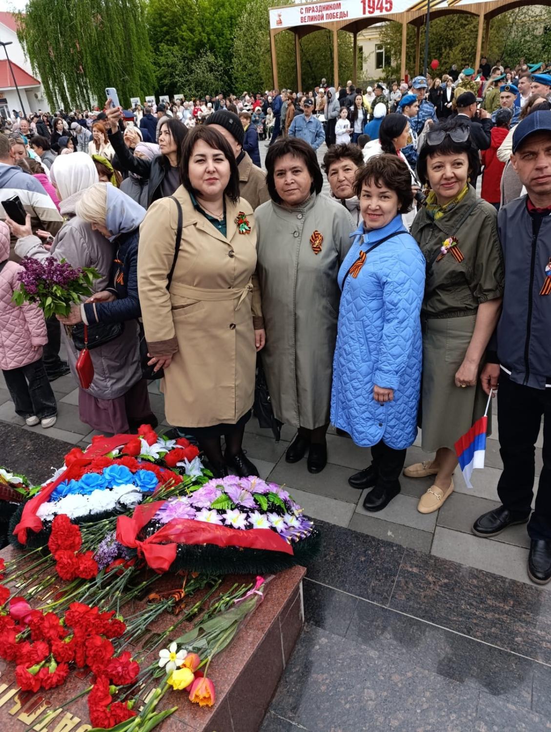 В рамках мероприятия сотрудники и педагоги вместе с директором школы Хабибулиной Р.И. возложили цветы к памятнику вечного огня,почтили память тех, кто ценой своей жизни обеспечил нам мирное небо.